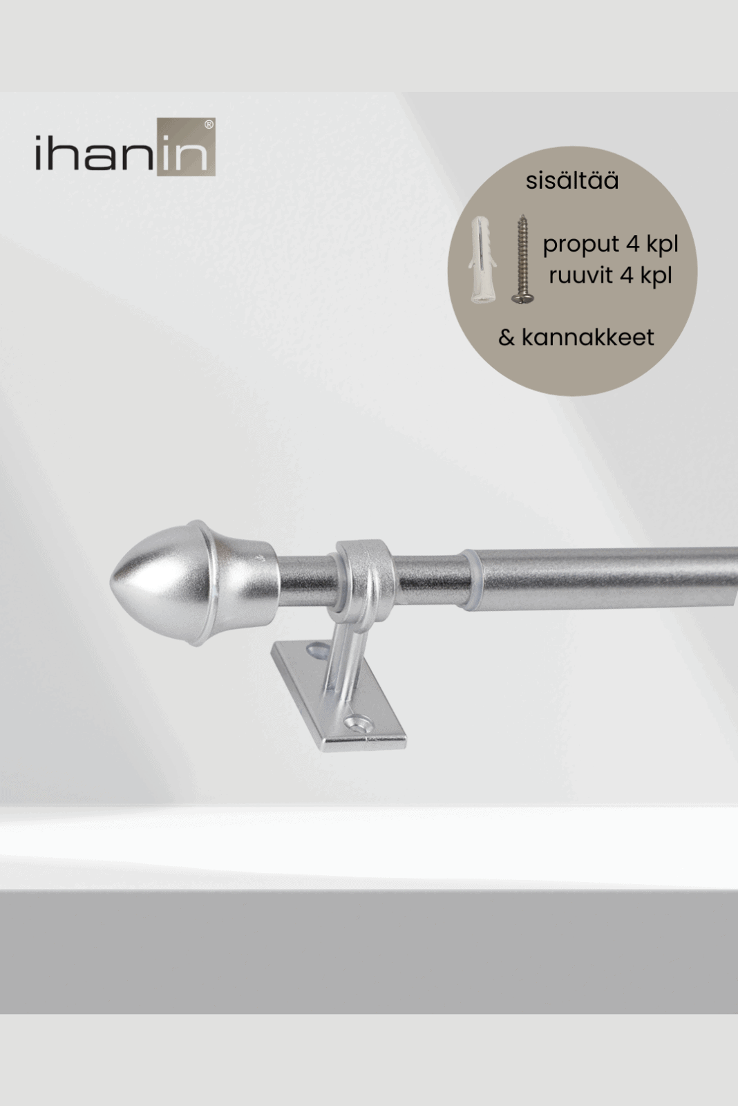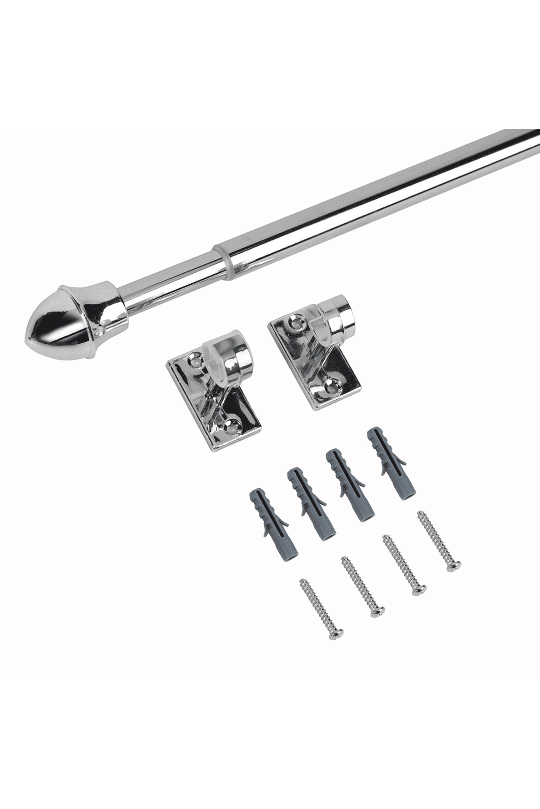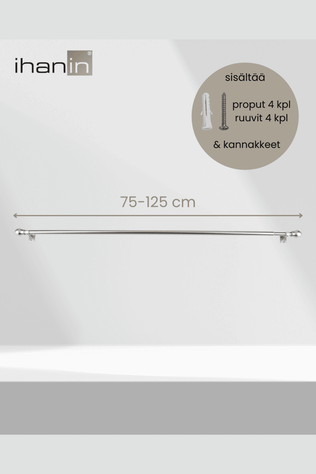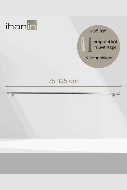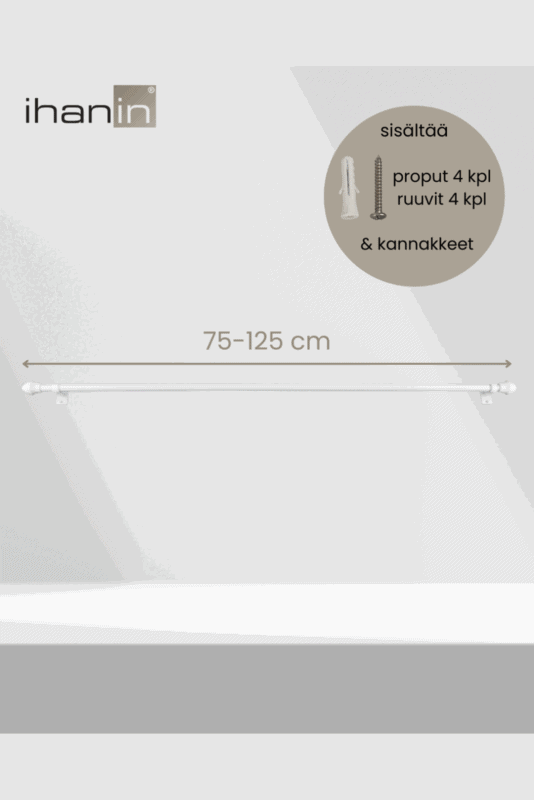 - Tanko on säädettävissä 75-125 cm välillä ja putken halkaisija on 11/ 13 mm. Pakkaus sisältää kannakkeet (2 kpl), ruuvit (4 kpl) ja proput (4 kpl).