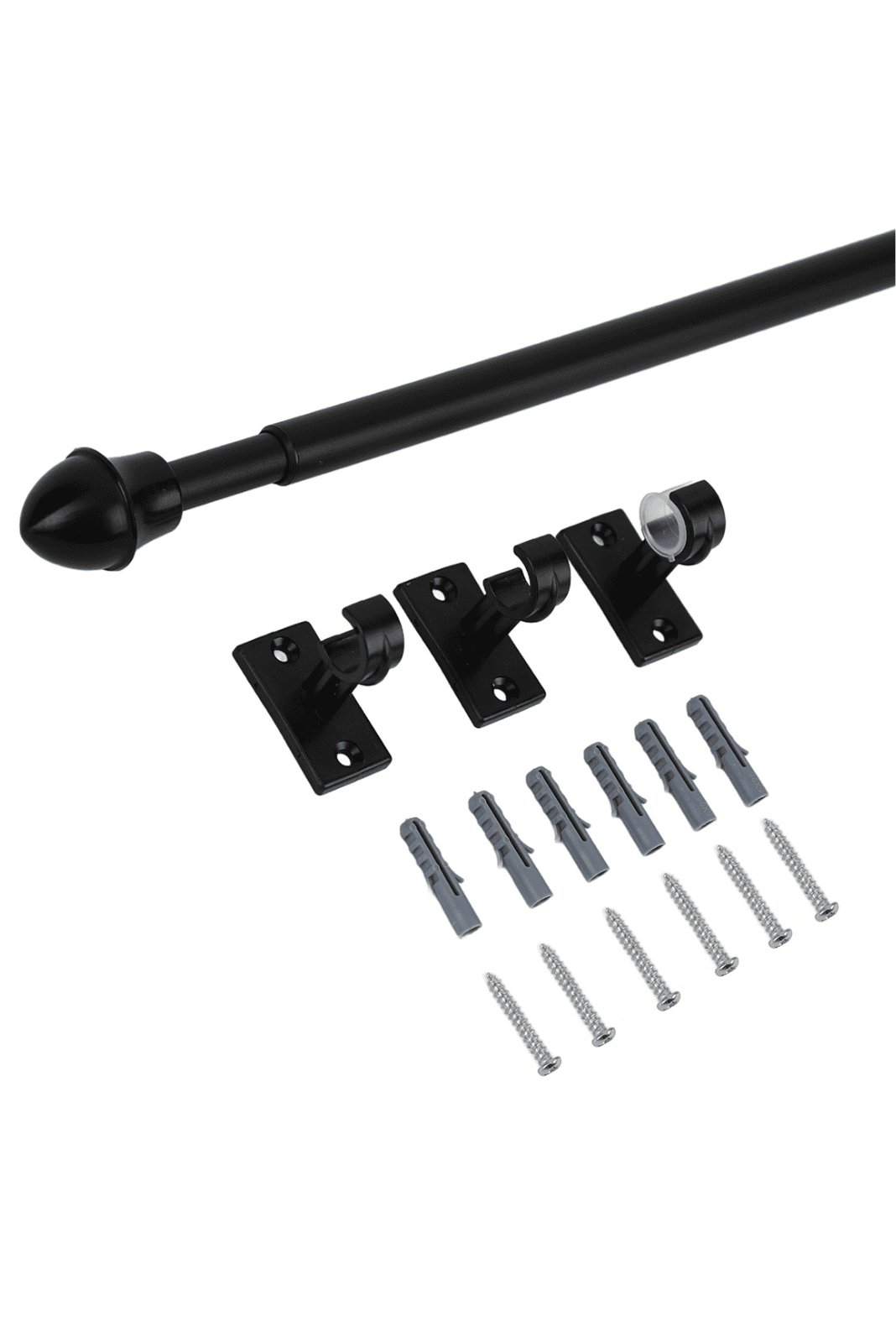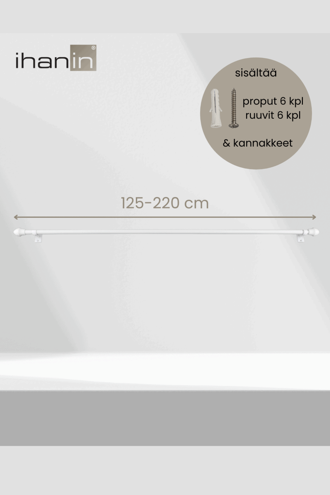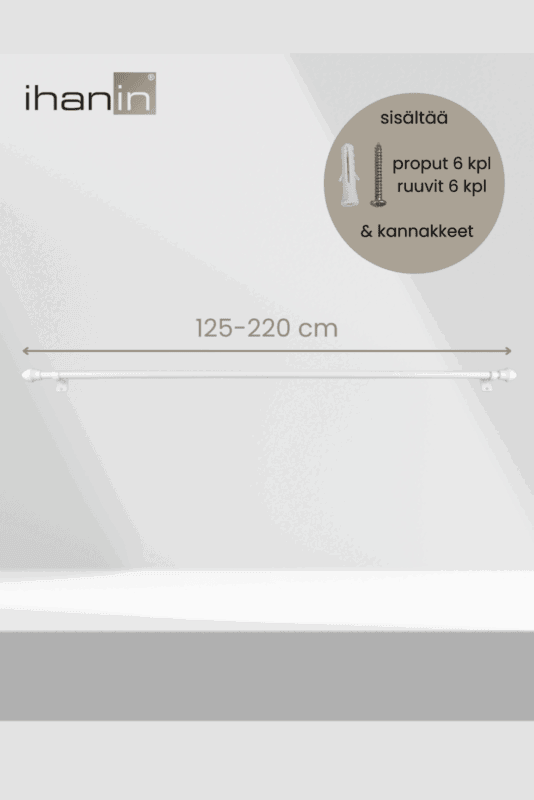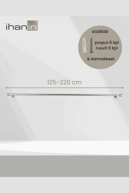 - Tanko on säädettävissä 125-220 cm välillä ja putken halkaisija on 11/ 13 mm. Pakkaus sisältää kannakkeet (3 kpl), ruuvit (6 kpl) ja proput (6 kpl).